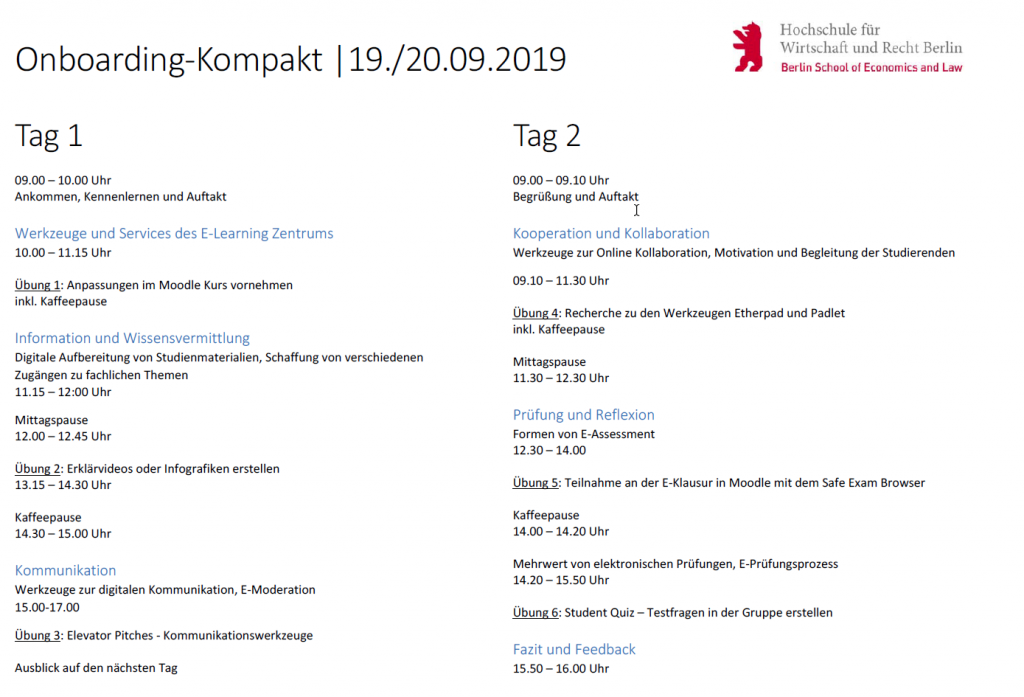 Onboarding-Kompakt ist ein zweitägiger Präsenzkurs. An zwei Tagen erwartet Sie ein intensives Workshop/Schulungsprogramm, zu dem wir 8 bis maximal 16 Teilnehmende einladen. Wie in der Onlinevariante werden wir die Lehrszenarien