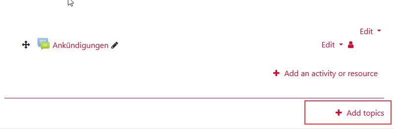 Furthermore, the courses are preset with only one topic. Lecturers can add further topics by themselves To do this, click on the plus icon below the first topic in editing mode.