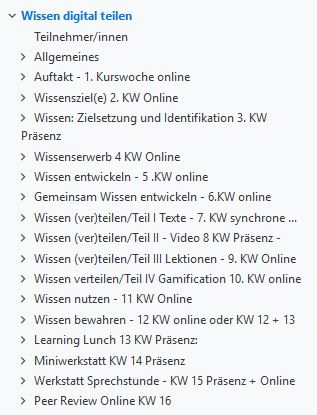 Mit dem Erreichten können wir m.E. zufrieden sein. Einige Themen sind schon befüllt, andere Bereiche nur grob angedacht, formatiert ist kaum etwas und es bleibt noch unheimlich viel Arbeit am Kurs offen. Das freie Moodle hat zudem so einige Lücken, es gibt z.B. keinen Fortschrittsbalken und keine H5P-Anwendungen. Viele Plugins die für uns schon selbstverständlich sind, habe ich hier vermisst. Aber zur groben Strukturierung genügt es und die spätere Feinarbeit im eigenen Moodlesystem bleibt den jeweiligen Nutzer/innen überlassen.