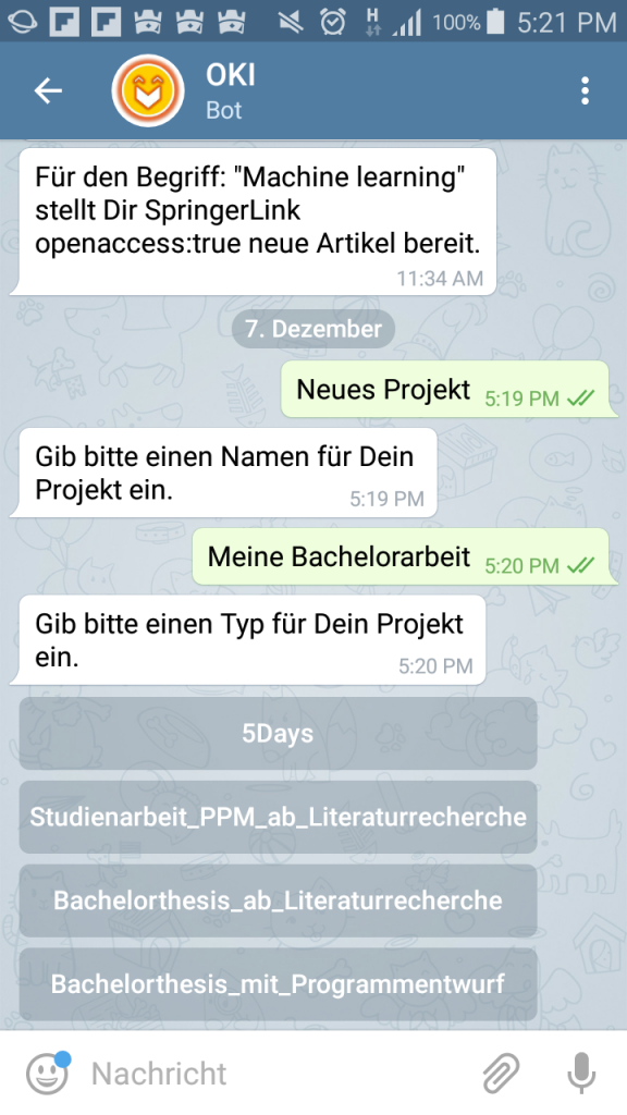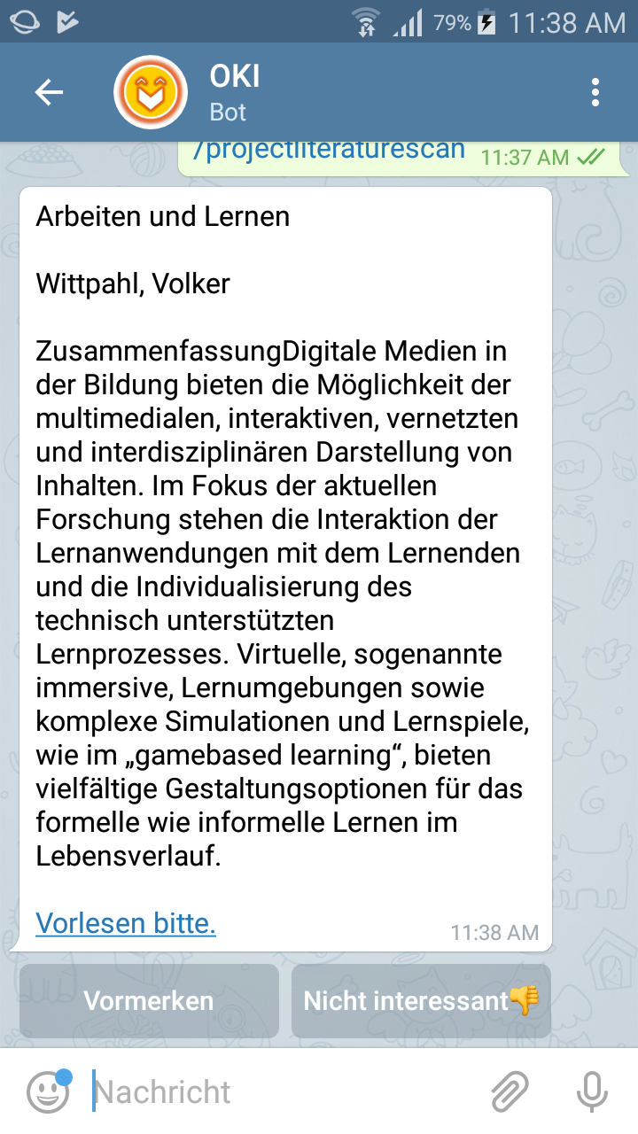 Hat man einmal seine Suchbegriffe eingegeben, so sucht OKI im Hintergrund täglich nach geeignete Literatur und informiert den Nutzer, sobald etwas Neues gefunden wurde. Man kann die passenden Vorschläge als interessant markieren und bekommt so eine Literaturliste mit Links zu unterschiedlichen Artikeln erstellt, die jederzeit aufrufbar ist.