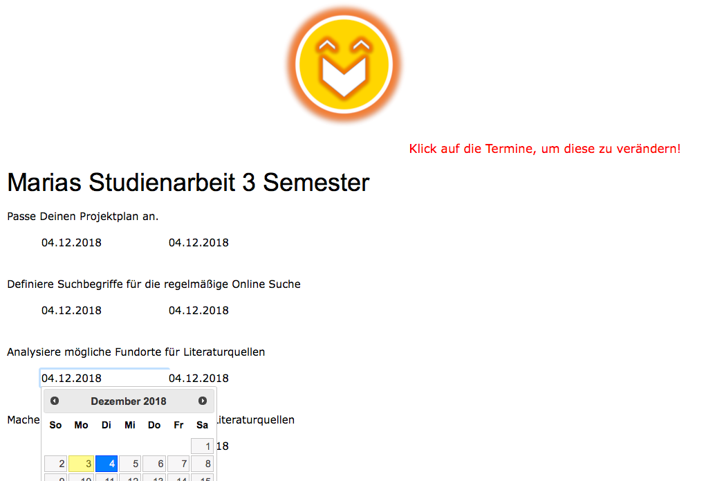 In OKI sind allgemeine wissenschaftliche Projektpläne, d.h. die typischen Schritte bei der Erstellung einer bestimmten Hausarbeit, integriert. Der Assistent gibt aber dem Nutzer die Möglichkeit, die vordefinierten Projektpläne genauer auf seine jeweiligen Anforderungen und Bedürfnisse zuzuschneiden. Dazu bekommt man eine Weboberfläche angezeigt, wo man die vordefinierten Termine und Projektschritte verändern kann: