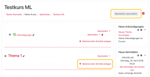 Schalten Sie zunächst in Ihrem Moodle-Kurs den Bearbeitungsmodus ein und fügen dann im gewünschten Abschnitt eine neue Aktivität hinzu.
