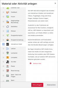 In der Liste der möglichen Aktivitäten oder Materialien wählen Sie Interaktiver Inhaltaus. Es ist ebenso ein kleines H5P-Icon zu sehen.