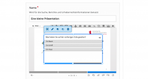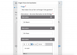 Zur Veranschaulichung fügen wir eine Single-Choice-Frage – eine Frage mit einer richtigen Antwort – in die angezeigte Folie ein. In das Fenster, das sich öffnet, fügen Sie Ihre Frage(n) hinzu. Die erste Antwortalternative ist die richtige Antwort.