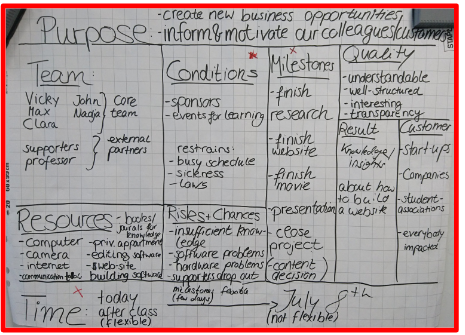 Die Startups werden über die Vorteile des Verfahrens informiert und gemeinsam mit dem Dozenten werden Prozesse ausgewählt, die von Teams von 4-5 Studierenden im Verlauf von 6-8 Wochen bearbeitet werden können. Für das Projektmanagement wird die agile Methode Scrum benutzt, die aus der Softwareentwicklung stammt.
