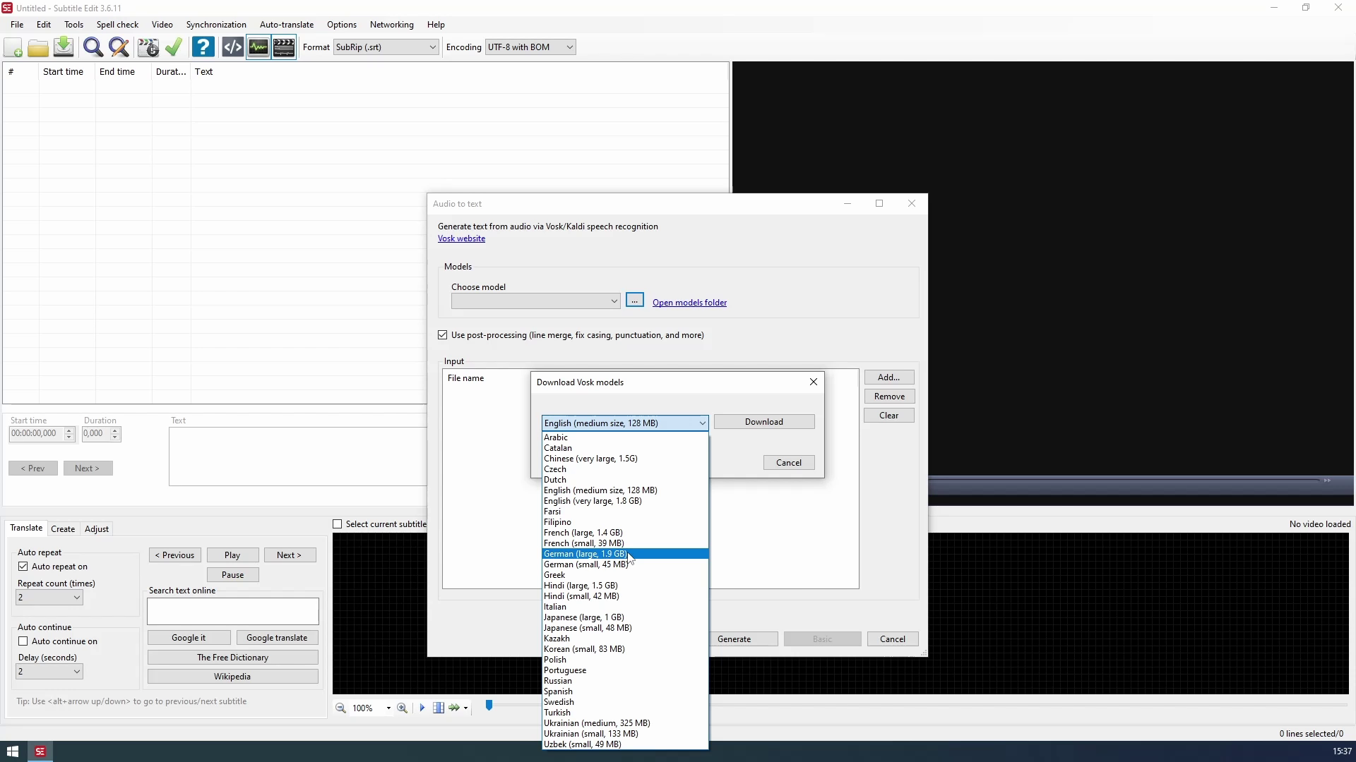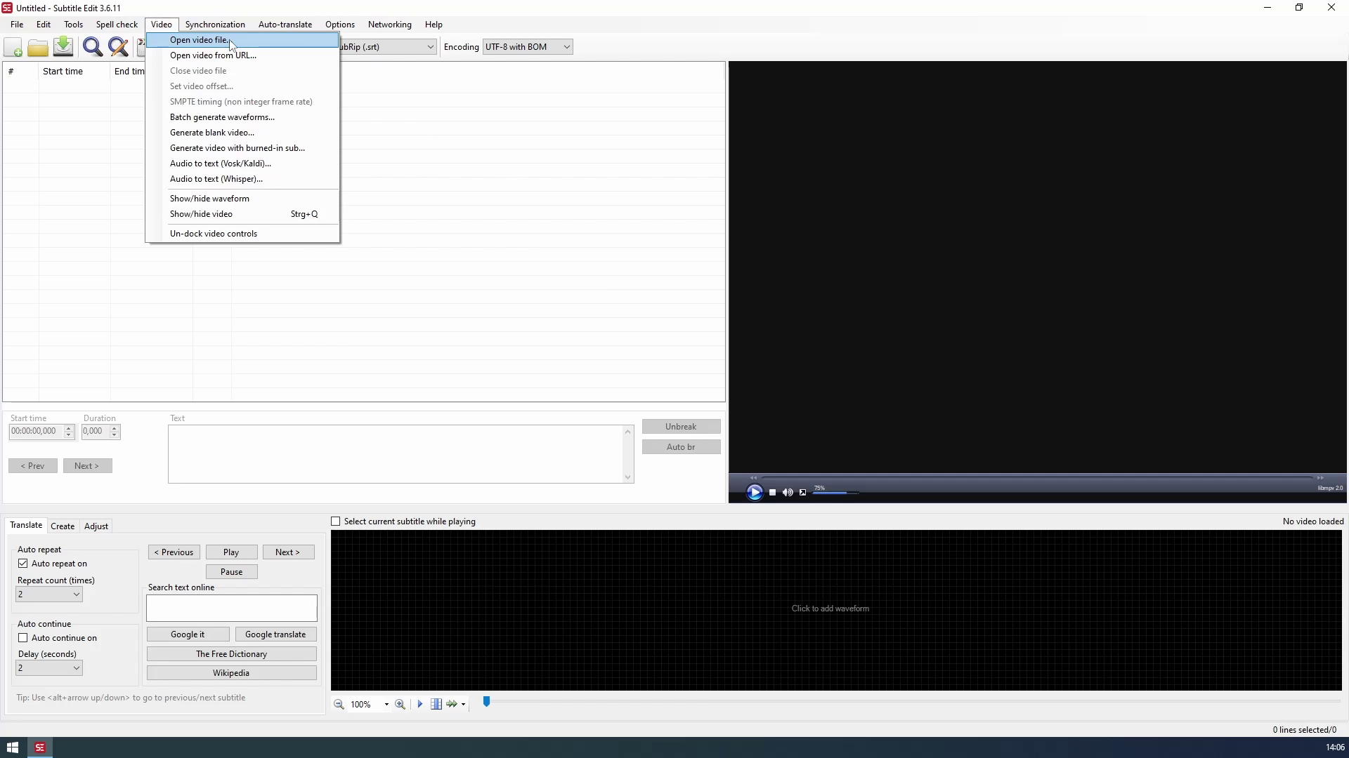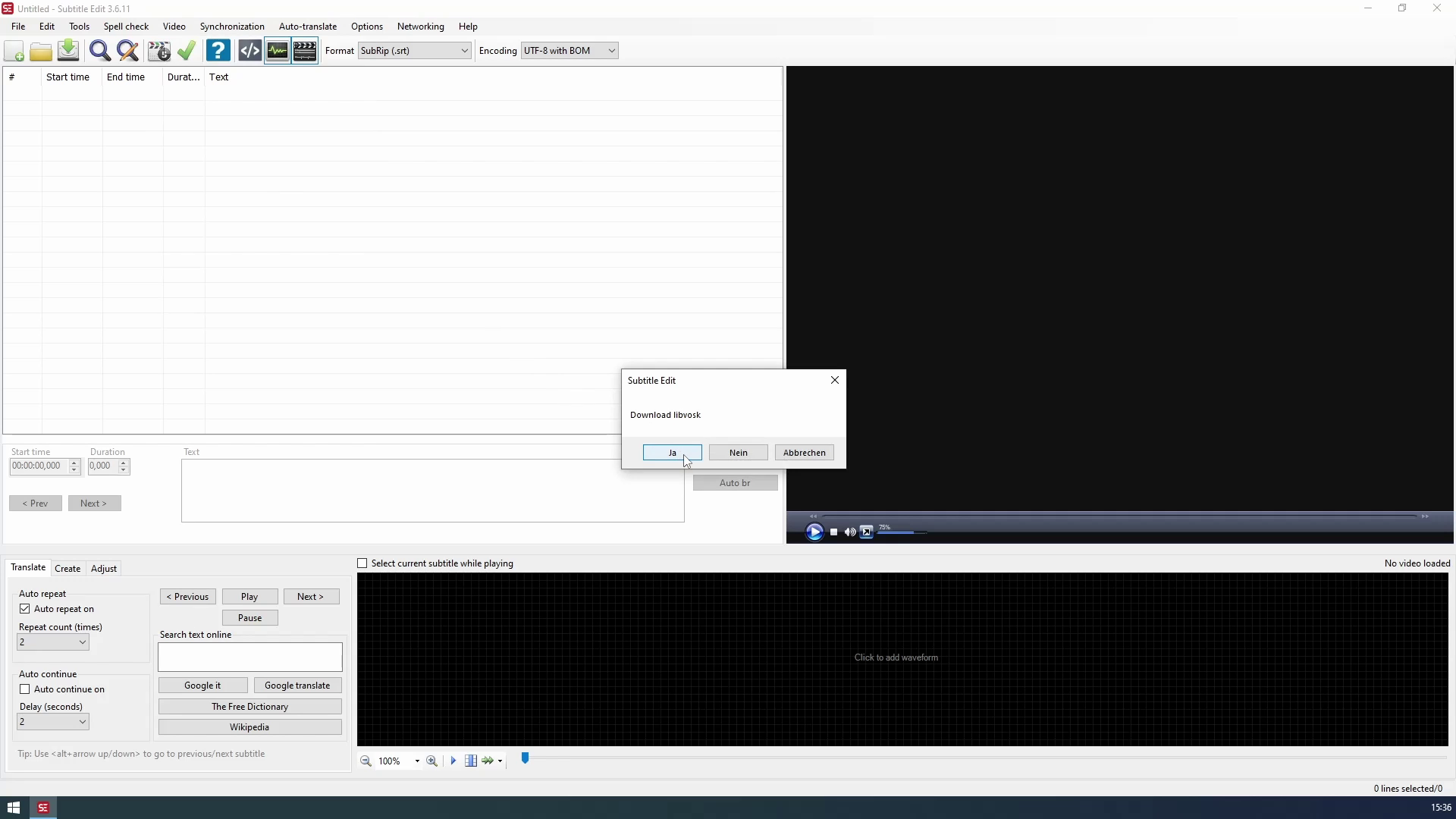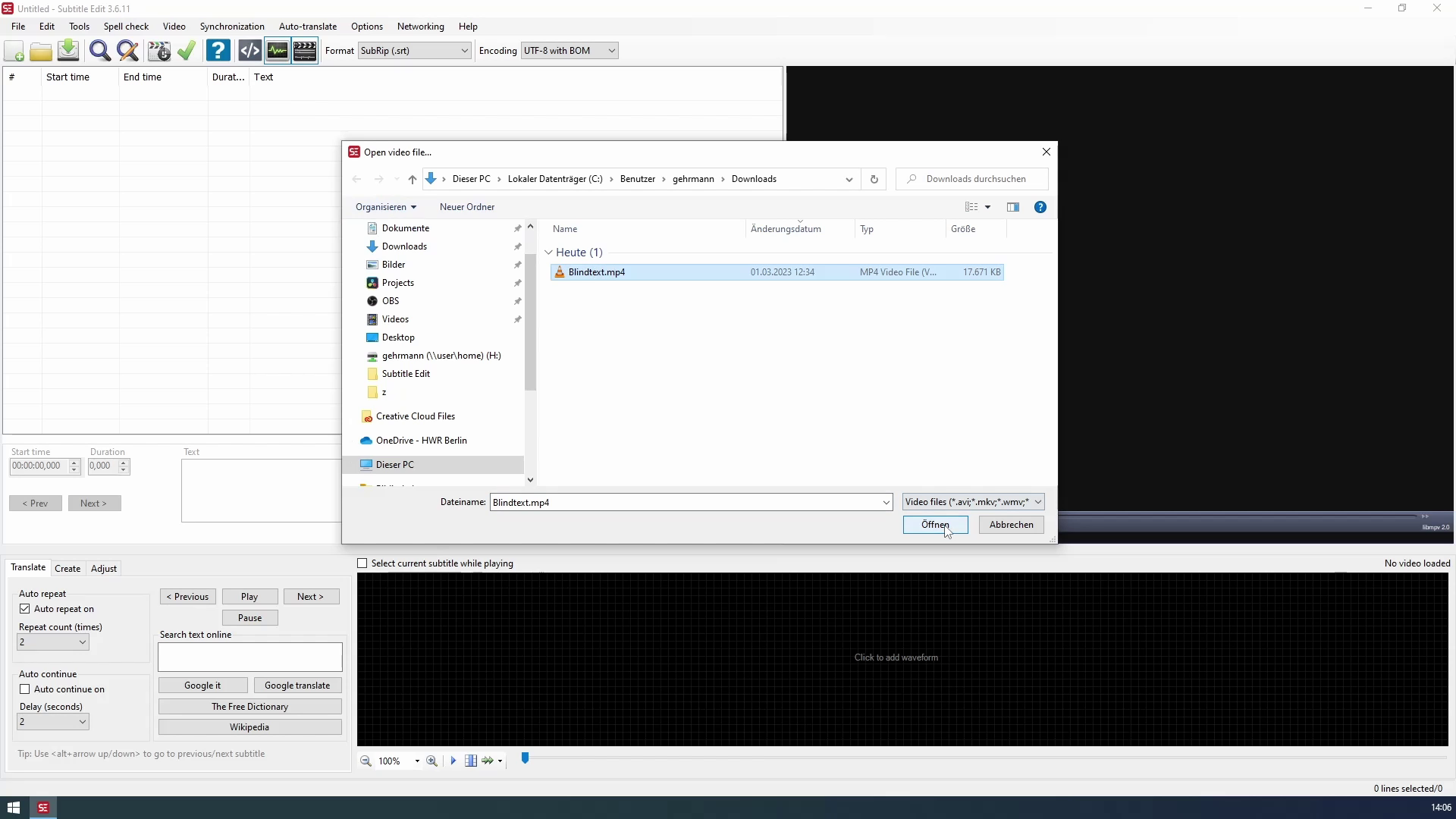 Beachten Sie, dass für das automatische Erstellen von Untertiteln sowie für das Abspielen von Audio- und Videodateien das Programm, wie in dem Tutorial „Subtitle Edit einrichten“ beschrieben, konfiguriert sein muss.