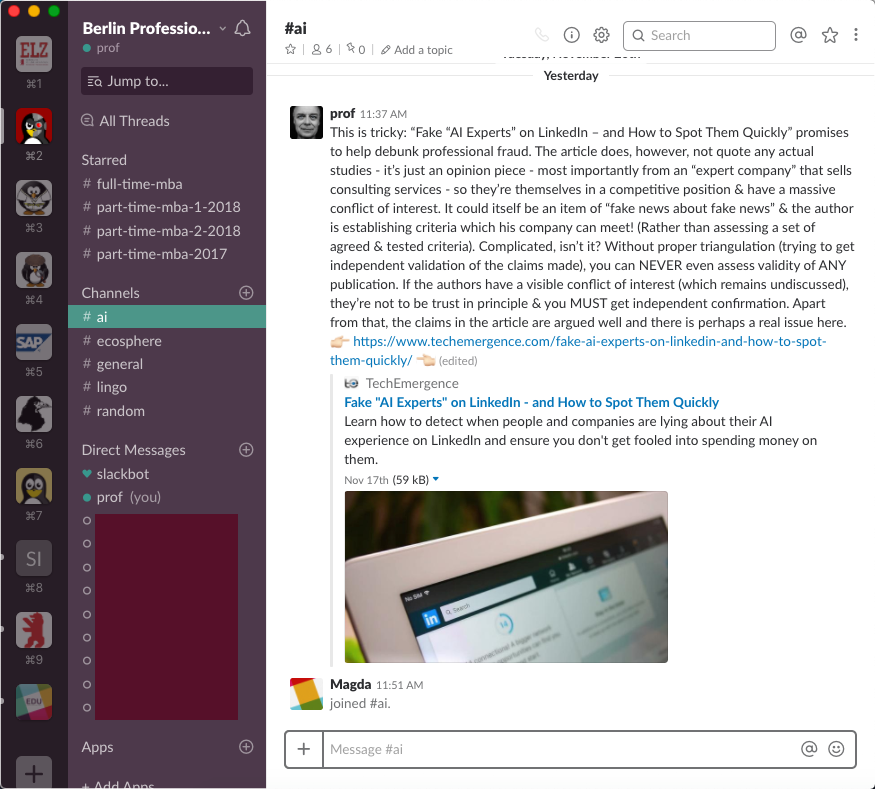 Slack ist nach sogenannten Kanälen organisiert. Jedes Slack-Team (bspw. ein Kurs) ist ein Workspace, in dem man beliebig viele öffentliche oder private Kanäle einrichten kann. Die Kanäle sind in meinen Slack Spaces Themen zugeordnet. So kann ich Ressourcen zu den Themen Künstliche Intelligenz, Digitalität usw. am richtigen Ort posten. Das alles ist nicht weltbewegend, aber deutlich besser als E-mail oder Forennachrichten. Die Bandbreite an Ressourcen reicht von Videos über Artikel und Gifs, um Laune zu verbreiten oder einen Akzent zu setzen, bis hin zu Nachrichten zum Kurs selbst.
